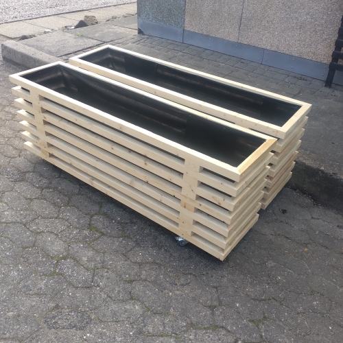 Under kasserne monterer vi enten ben eller hjul. Ønsker du en plantekasse med hjul, gør det den nem at flytte rundt på terrassen eller i haven. De lange plantekasser forstærkes med ekstra stivere, så konstruktionen forbliver stabil – også når de fyldes med jord.